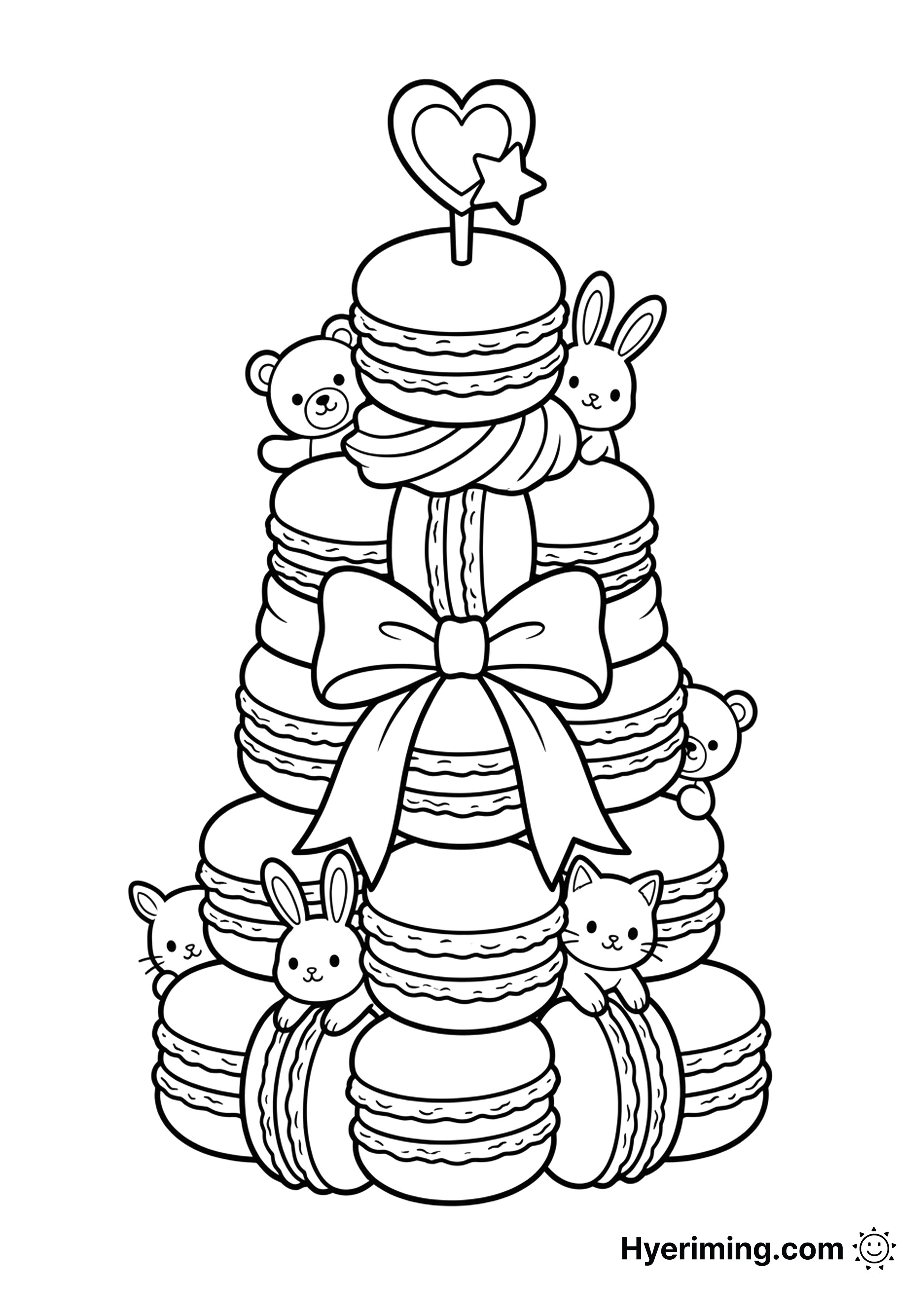 마카롱을 층층이 쌓아 만든 타워 케이크를 색칠하는 디저트 색칠공부 도안입니다. 파티 분위기를 느끼며 달콤하게 꾸며보세요.