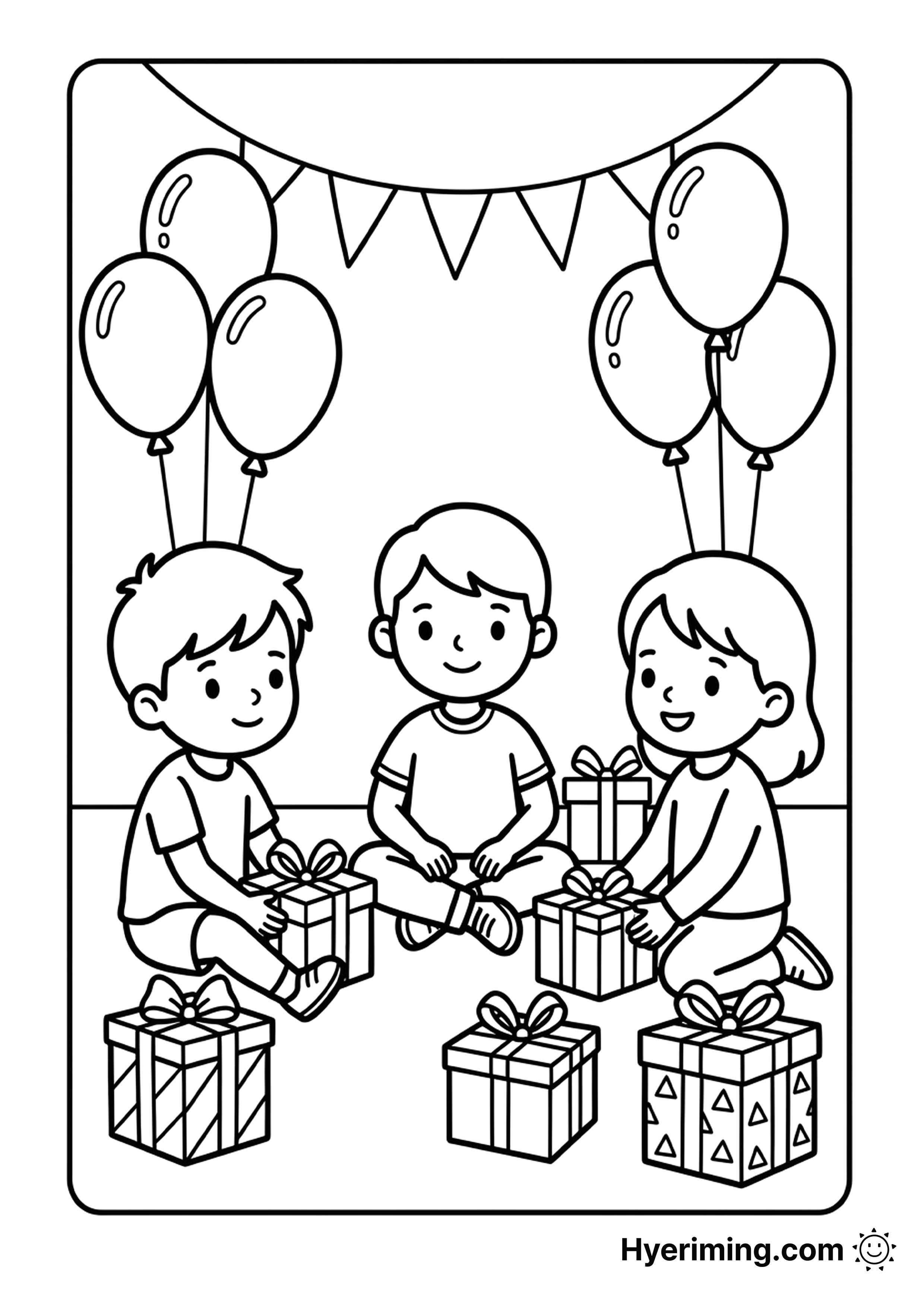 생일 선물이 가득한 파티 장면을 색칠하는 색칠공부 도안입니다. 축하 분위기를 표현하며 즐겁게 활동할 수 있어요.